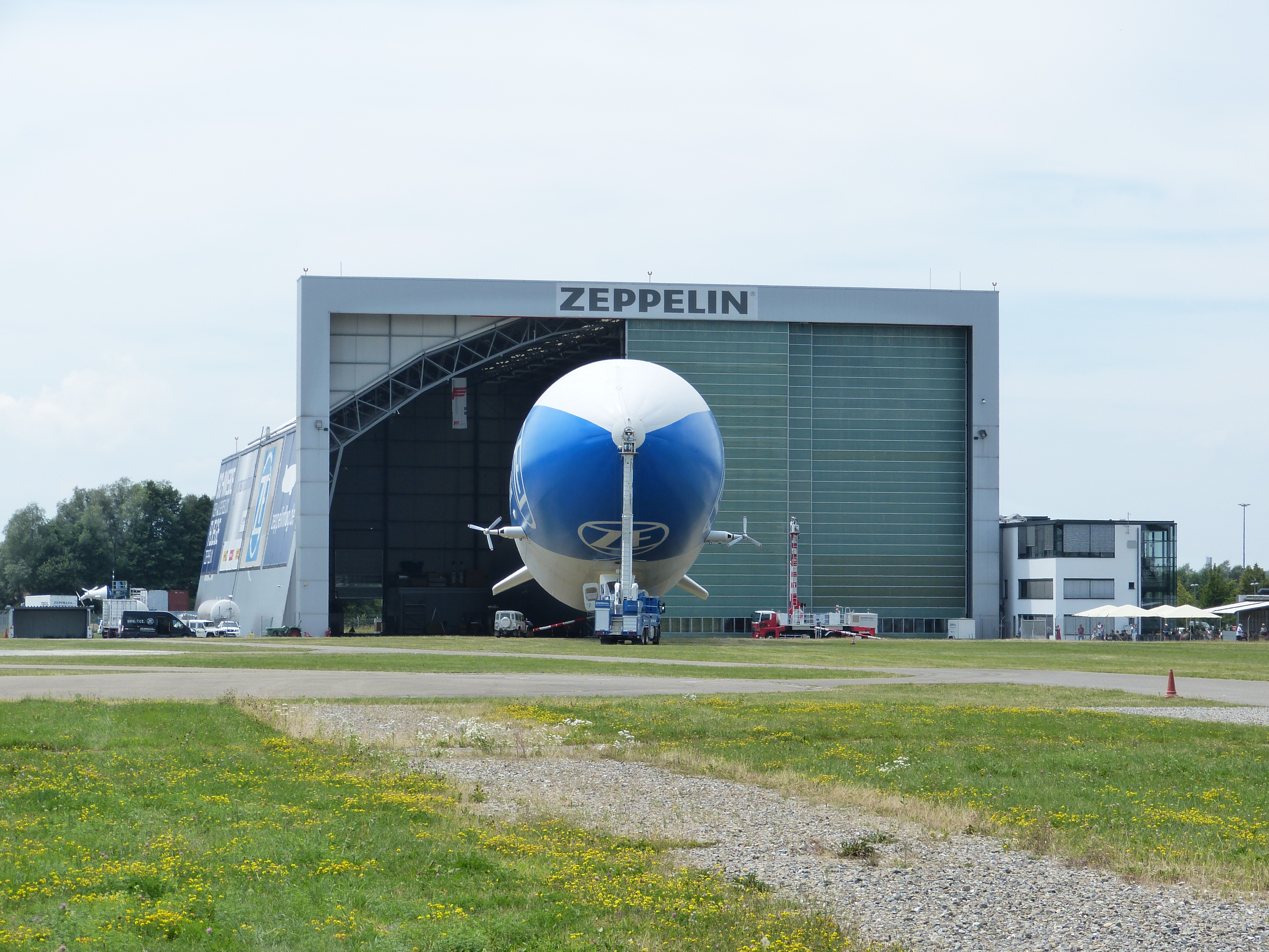 Zeppelin NT beim Landeanflug auf dem Rollfeld in Friedrichshafen. (rechts/links eigene Aufn. Flugplatz Friedrichshafen 2019).